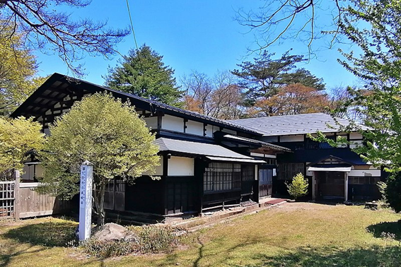 | 長岐家は、江戸時代初期より代々七日市村の肝煎(現在の村長)を務め、農村の興隆に尽くした 家柄です。 中心とした庭園がもうけられています。現存する長岐邸建物には、屋根裏から発見された破魔矢板形 の棟札や、束柱の梁仕口穴の墨書から文政13年(1830年)に新築されたことがわかっています。 長岐邸の外観は佐竹本陣としての表構えが強調されています。街道に面した西面は、整然と区切ら れた化粧梁、化粧束、棟木下の雲形の木鼻などが特徴的です。また、屋根には現在の亜鉛鉄板葺きに 葺き帰る前は、杉板葺き石置き屋根であり、当時の秋田藩の家作禁令を超えるものでした。 建物内部の北西側の格式の高い書院座敷、釘隠しなどの意匠は、農家建築では見られないものです。 このように長岐邸は、秋田藩の本陣を務めた肝煎屋敷の様相を現代に伝える県内でも数少ない貴重 な建造物です。 |