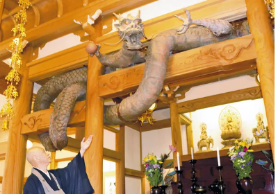 | 曹洞宗の寺で荘厳な竜の彫刻が本堂に飾られ、参拝者を出迎えている。 本堂は2006年5月に焼失し、2008年11月に建て直された。焼失前の本堂の入り口には竜の彫り物が 施されており、新たに彫られた力強い竜は再建のシンボルとなっている。 目を見開いた竜の表情や玉を持つ手、躍動感のある胴体など細かな造形にこだわり、 付くようにうねる全長約13メートルの竜が表現されている。 龍泉寺には、地元の竜ヶ森からの地下水がわき出る池があり、竜は象徴的な存在。 |