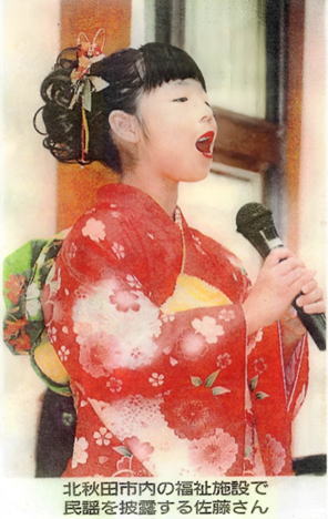 | 令和6年夏、秋田県大仙市で開催された「第33回あきたおばこ節全国大会」の年少の部で、 最優秀賞の栄冠を手にした鷹巣東小学校二年生、佐藤茉侑(さとうまゆ)さん (8歳)を 紹介いたします。 本人、小学生になったばかりの昨春、たまたま立ち寄った能代市の商業施設で、 若手民話歌手の唄を聞いて民謡に興味を持った。「キラキラしてかっこいい」。 家族に相談し、北秋田市の民謡教室に通い始めた。 |